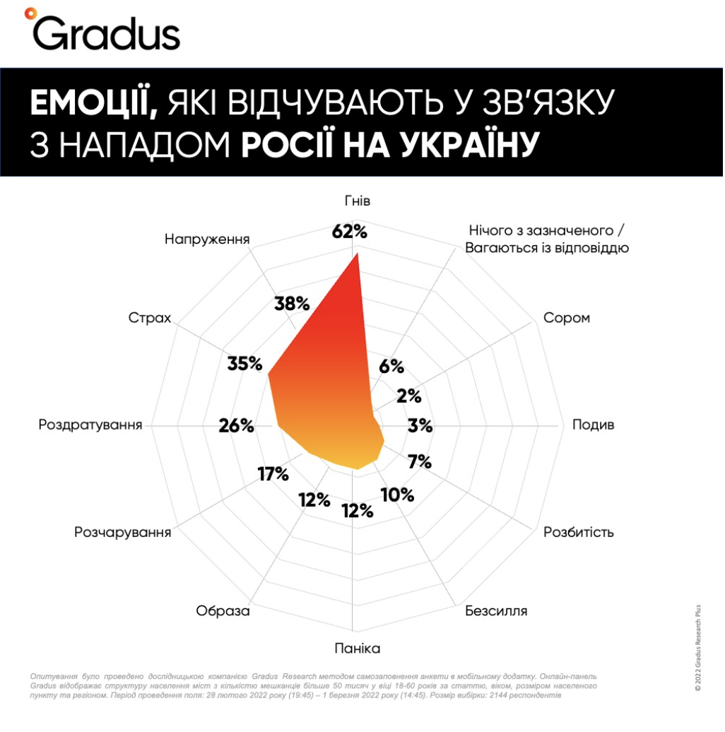 Аналитики отмечают, что наиболее распространенные эмоции, которые испытывает население Украины из-за полномасштабного военного вторжения России, — гнев (62%) и напряжение (38%). Еще 35% украинцев испытывают стресс в связи с действиями российских оккупантов.