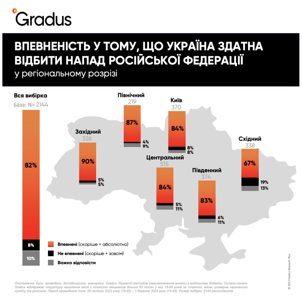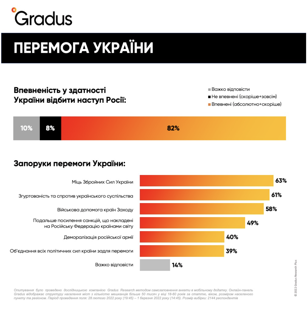 Несмотря на огромный уровень стресса, украинцы верят в способность отразить наступление России (82%) и в то, что после войны Украина станет сильнее (77%). Об этом говорится в опросе Gradus Research.