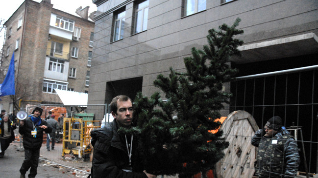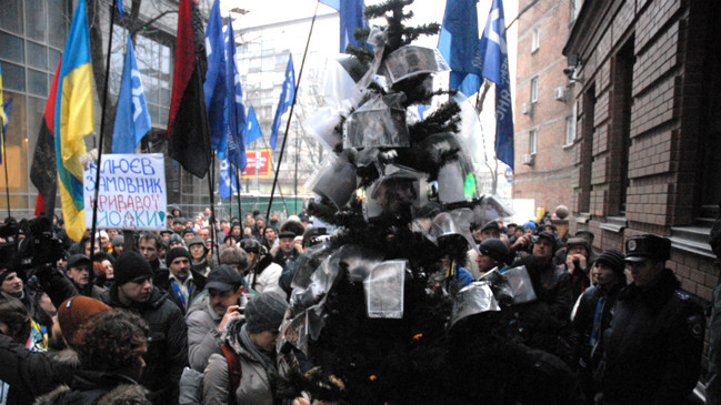 Около тысячи митингующих принесли в офис секретаря СНБО Андрея Клюева в Киеве "кровавую елку". Об этом сообщает 5 канал.