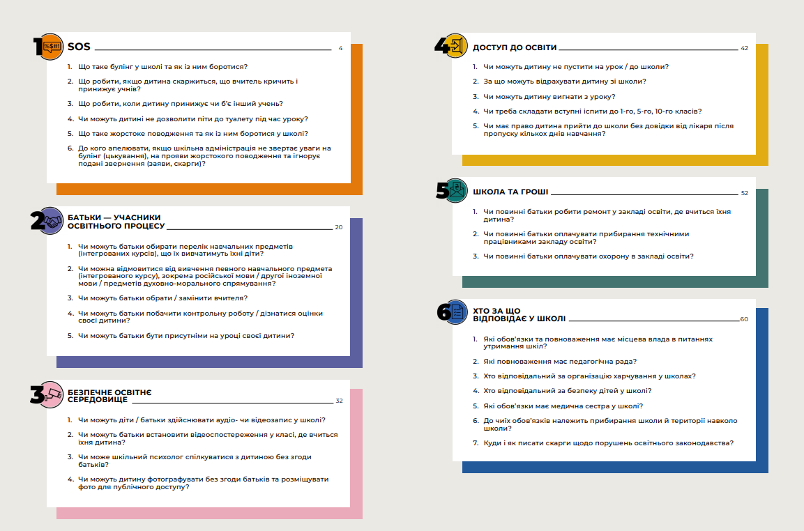 Путеводитель разделен на шесть разделов, в первом из них - «SOS» - освещены вопросы противодействия буллингу и жестокому обращению в школе.