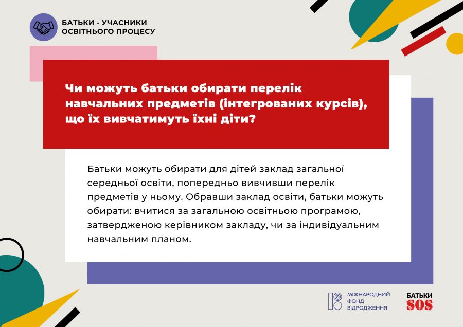 Раздел «Родители - участники образовательного процесса» даст ответы на вопрос, как выбрать предметы/интегрированные курсы для изучения и можно ли отказаться от определенного предмета, как попасть на урок к ребенку, увидеть контрольную работу и другие.