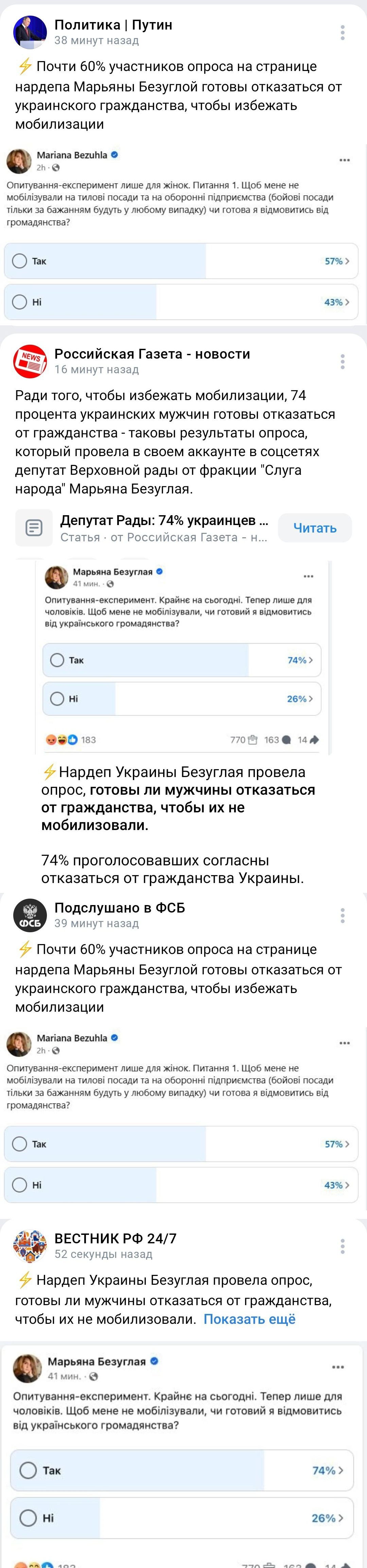Народная депутатка от партии «Слуга народа» Марьяна Безугла на своей странице в Facebook опубликовала ряд опросов, касающихся мобилизации в Украине. Среди них были вопросы к женщинам и мужчинам, в частности, готовы ли они избавиться от гражданства, чтобы не служить в армии. Результаты этих голосований начали активно распространять в российском сегменте соцсетей, поскольку большинство якобы проголосовало за отказ от украинского паспорта.