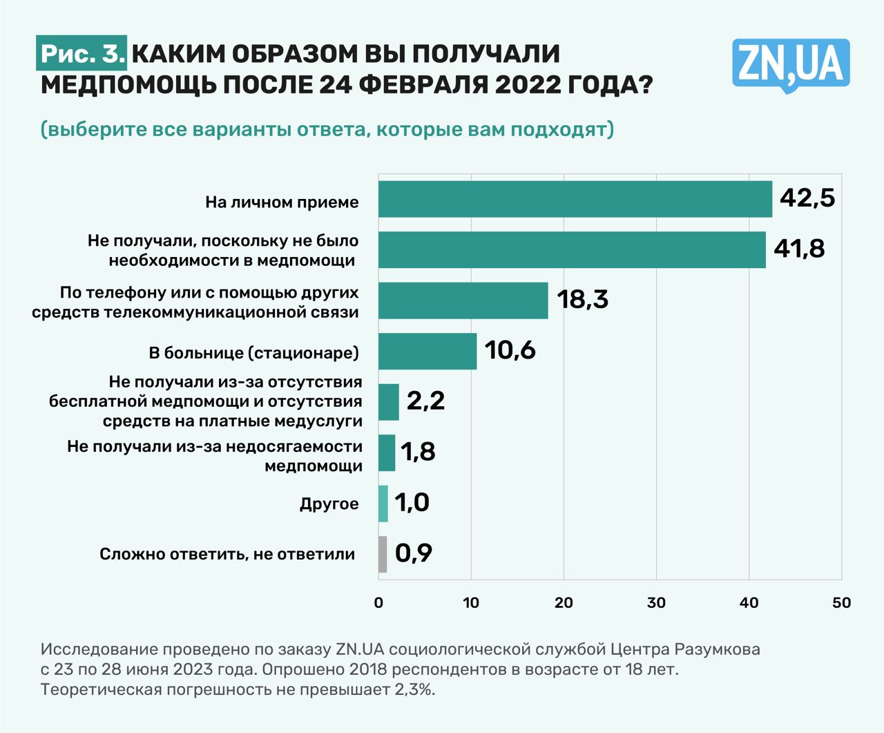 Подавляющее большинство украинцев после 24 февраля 2022 получали медицинскую помощь на личном приеме (42,5%) или в стационаре (10,6%), 18,3% опрошенных (причем всех возрастных категорий) консультировались с семейными врачами "телефоном или с помощью других средств телекоммуникационной связи", говорится в результатах опроса Центра Разумкова по заказу ZN.UA.