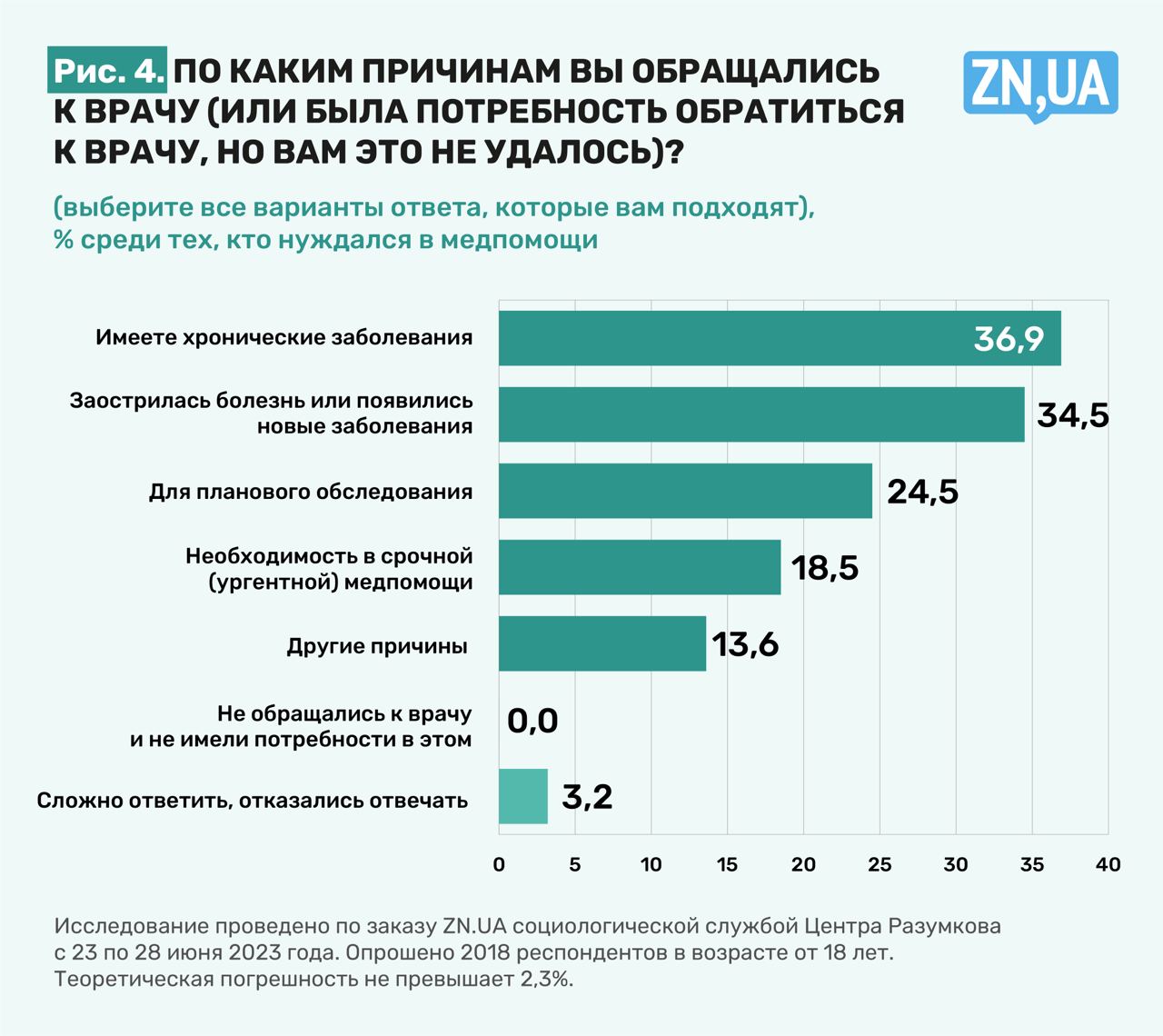 Из тех, кто с 24 февраля 2022 нуждался в медицинской помощи, чаще всего к врачу обращались из-за хронических заболеваний (36,9%). У 34,5% обострилась болезнь или появились новые заболевания, 18,5% нуждались в срочной (ургентной) медпомощи. И только 24,5% обращались к врачу для планового обследования.