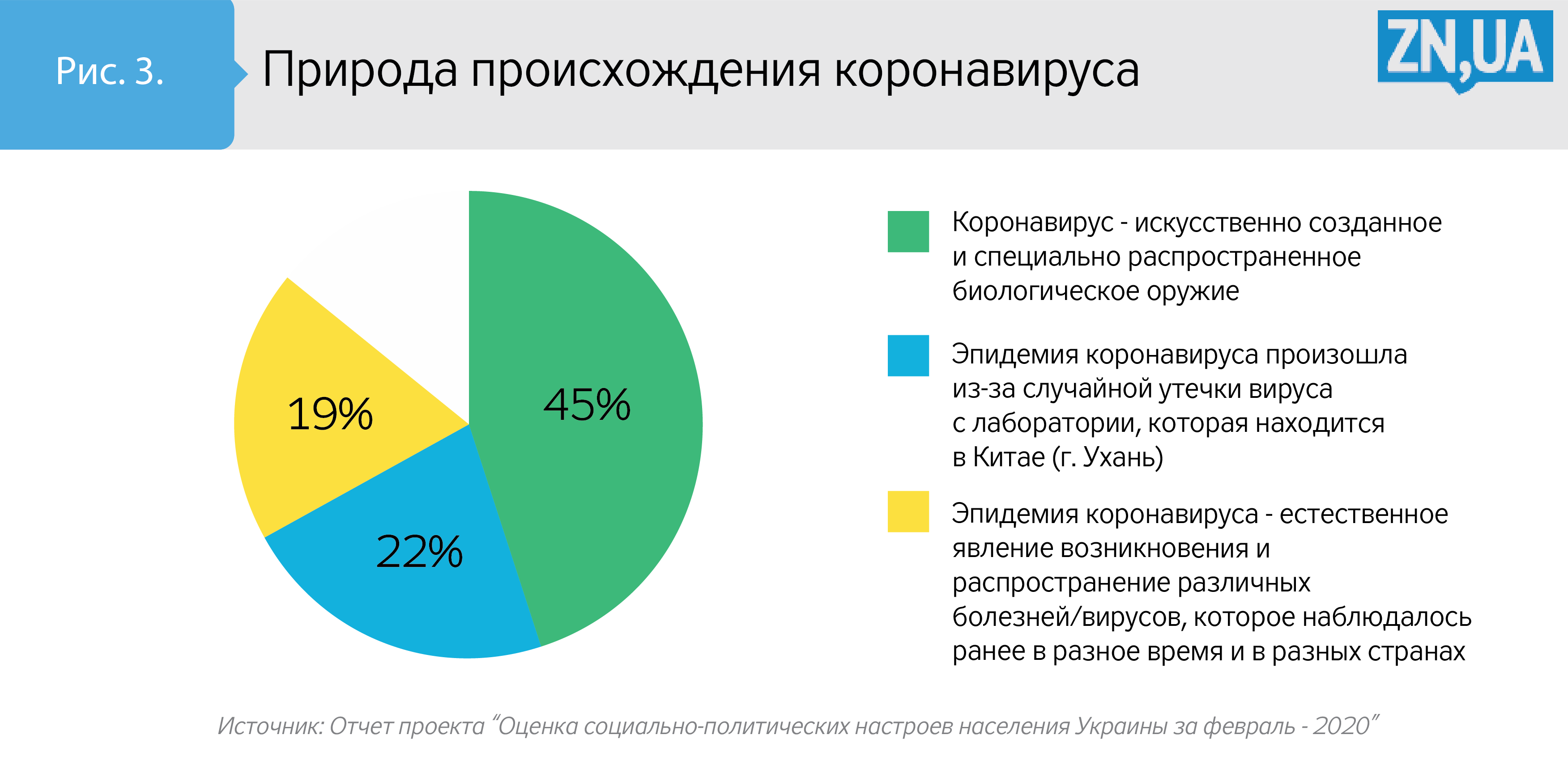 "Поскольку на данный момент источник происхождения вируса, который мог бы подтвердить его природное происхождение, не установлен (никто точно не может сказать, от какого животного коронавирус передался человеку, транзитный переносчик – панголин), в последнее время в СМИ циркулировало немало конспирологических версий. Естественным образом это отразилось и на ответах респондентов", - пишет в своей статье "Тест системе: коронавирус уже в Украине" Алла Котляр.