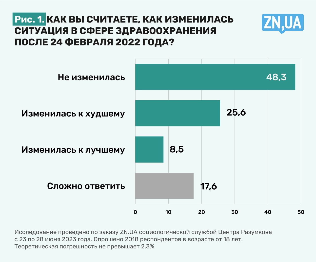 На вопрос: " Как вы считаете, как изменилась ситуация в сфере здравоохранения после 24 февраля 2022 года? " относительное большинство украинцев (48,3%) ответило, что "не изменилось". 25,6% убеждены, что "изменилась к худшему", 17,6% затруднились ответить. Изменения к лучшему увидели 8,5% граждан.
