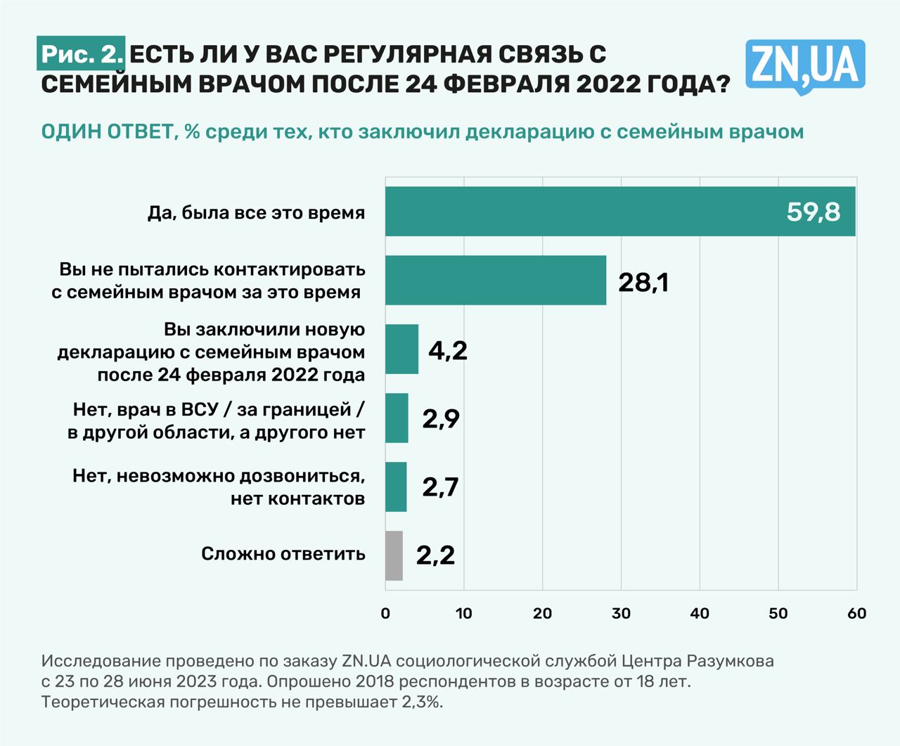 Только 5,6% пациентов не смогли связаться с врачом - у 2,9% врач "в ВСУ/за рубежом/в другой области, а другого нет"; 2,7% затруднились дозвониться или не имеют контакта с врачом. После 24 февраля 2022 года заключили новую декларацию 4,2% опрошенных. "Не пытались контактировать с семейным врачом за это время" 28,1% респондентов.