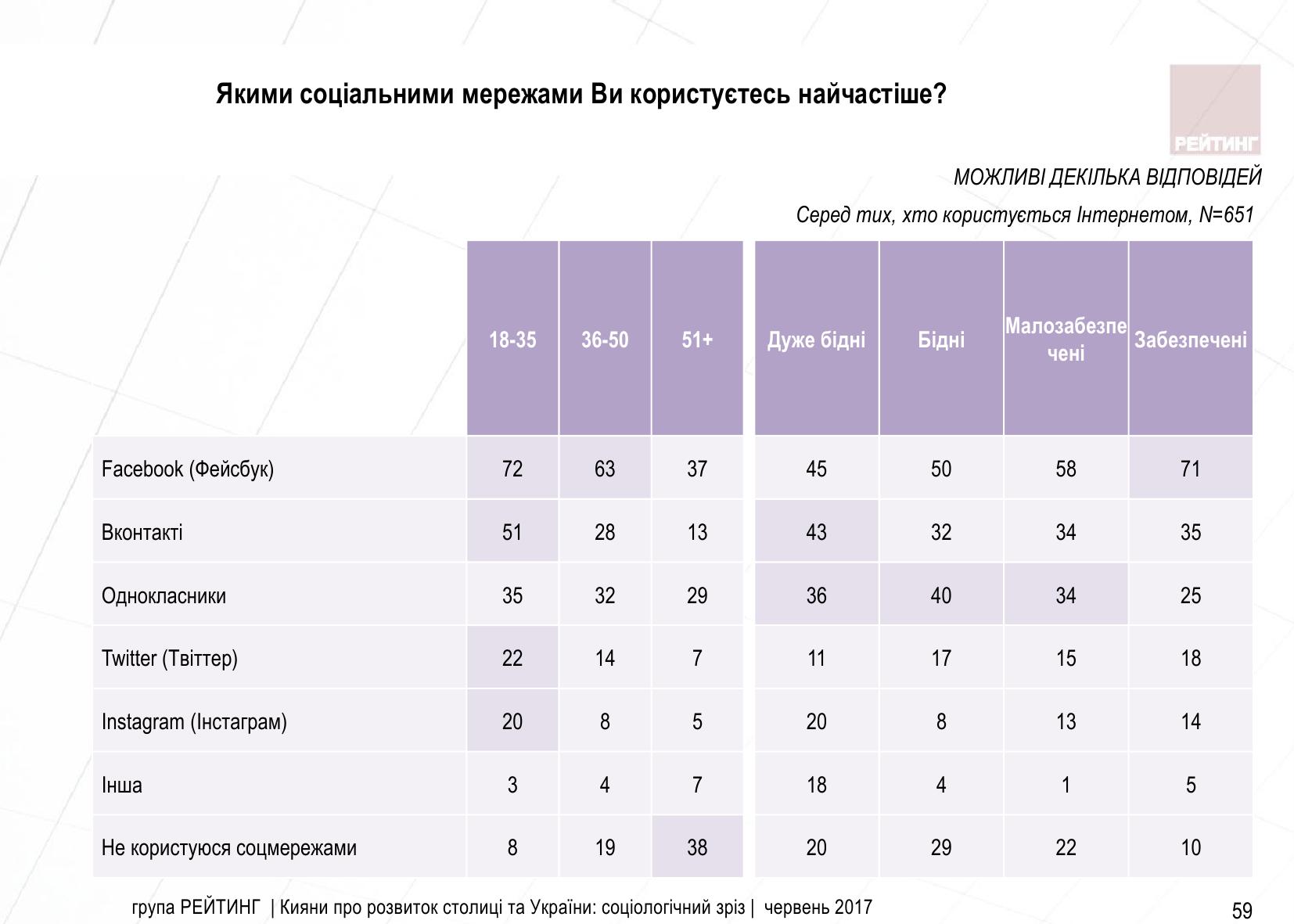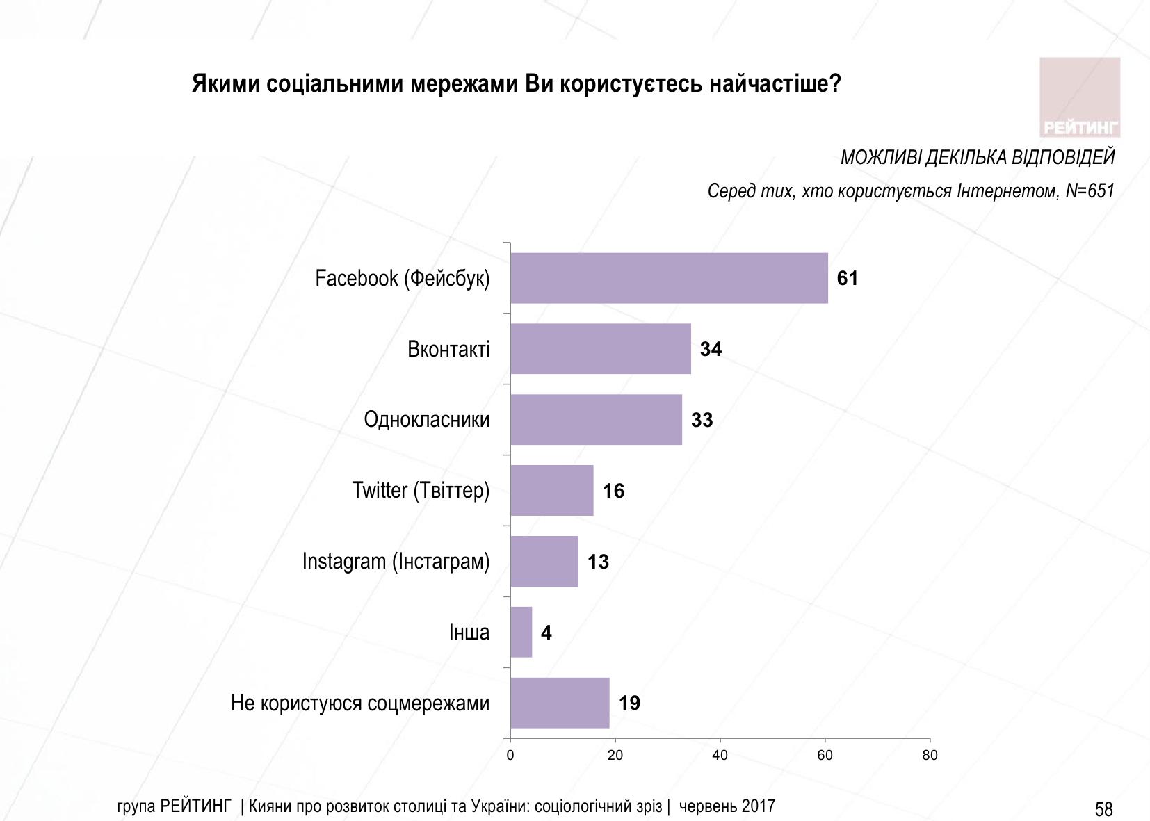 По данным опроса Социологической группы "Рейтинг", в целом по Украине в конце мая 48% интернет-пользователей находятся в соцсети Facebook, 44% - ВКонтакте, 43% - Одноклассники, 12% - Іnstagram, 8% - Twіtter, 8% - другой, 16% - не пользуются соцсетями. Жители Запада чаще пользуются Facebook, жители Юга - ВКонтакте и Одноклассники.