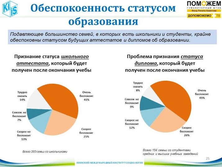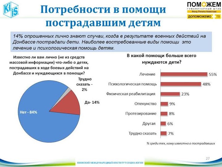 Также по результатам исследования, стало известно о пострадавших в результате боевых действий на Донбассе детей. Об этих случаях лично знают 14% опрошенных. 55% из этих детей нуждаются в лечении, 23% – в физической реабилитации. Половине необходима психологическая помощь.