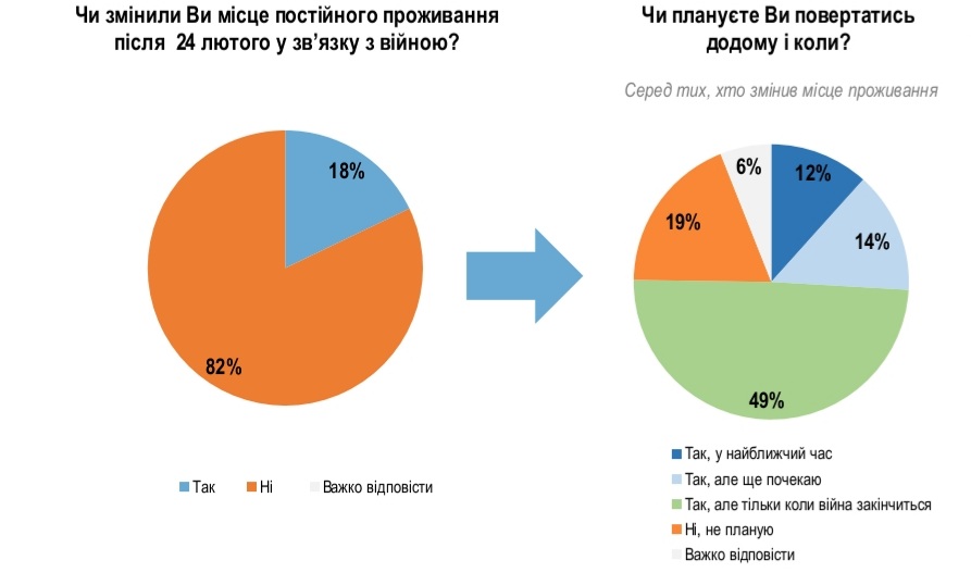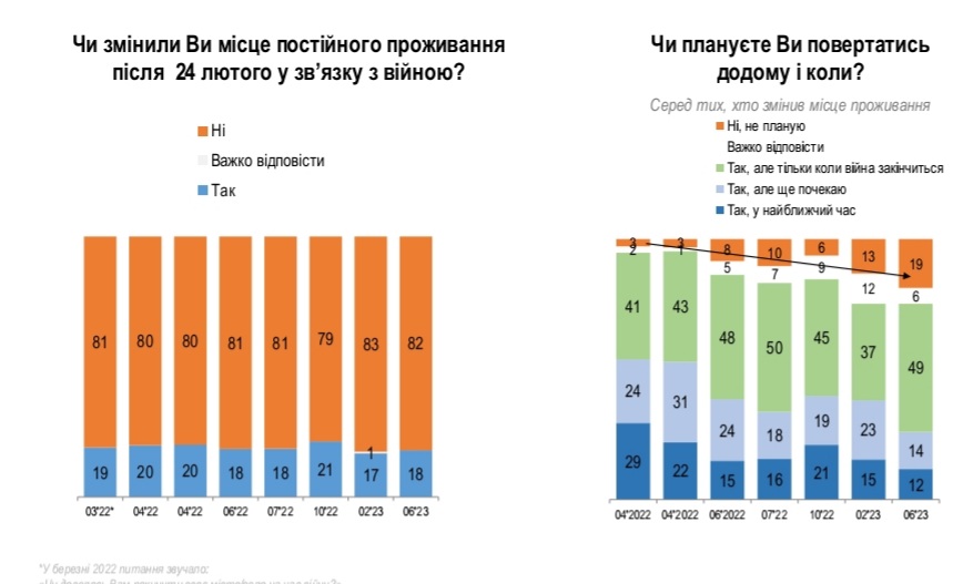 Среди перемещенных лиц 75% выражают намерение вернуться домой: 12% – в ближайшее время, 14% – хотят вернуться, но подождут, 49% – вернутся после окончания войны. В то же время 19% сообщили, что уже не вернутся домой.