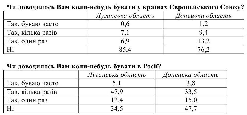 Тех, кто хоть раз посещал ЕС, несколько больше в Донецкой области – 24% против 15% в Луганской области.