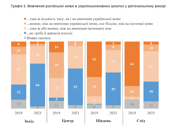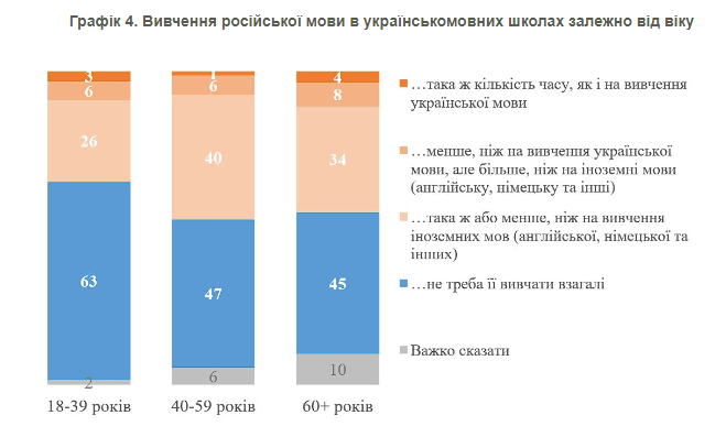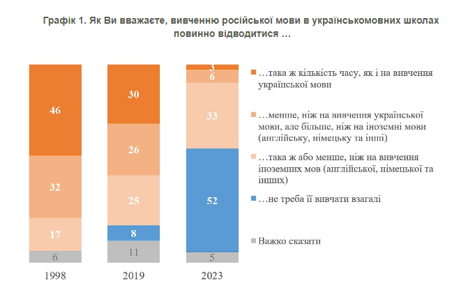 Так, в 1998 году 46% украинцев считали, что объем изучения должен быть таким же, как и для украинского языка. В 2019 году показатель приверженцев такого мнения составлял 30%, а сейчас – только 3%.