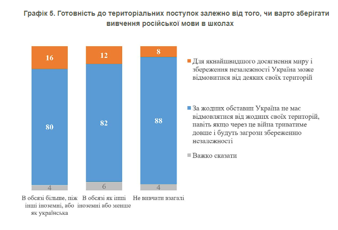 Также социологи пытались выяснить, на сколько готовы к территориальным уступкам респонденты в зависимости от их взглядов на изучение русского языка в школах. Хотя те, кто поддерживает сохранение изучения русского языка в школах, в большей степени склонны к уступкам, но даже среди них абсолютное большинство выступают против каких-либо территориальных уступок.