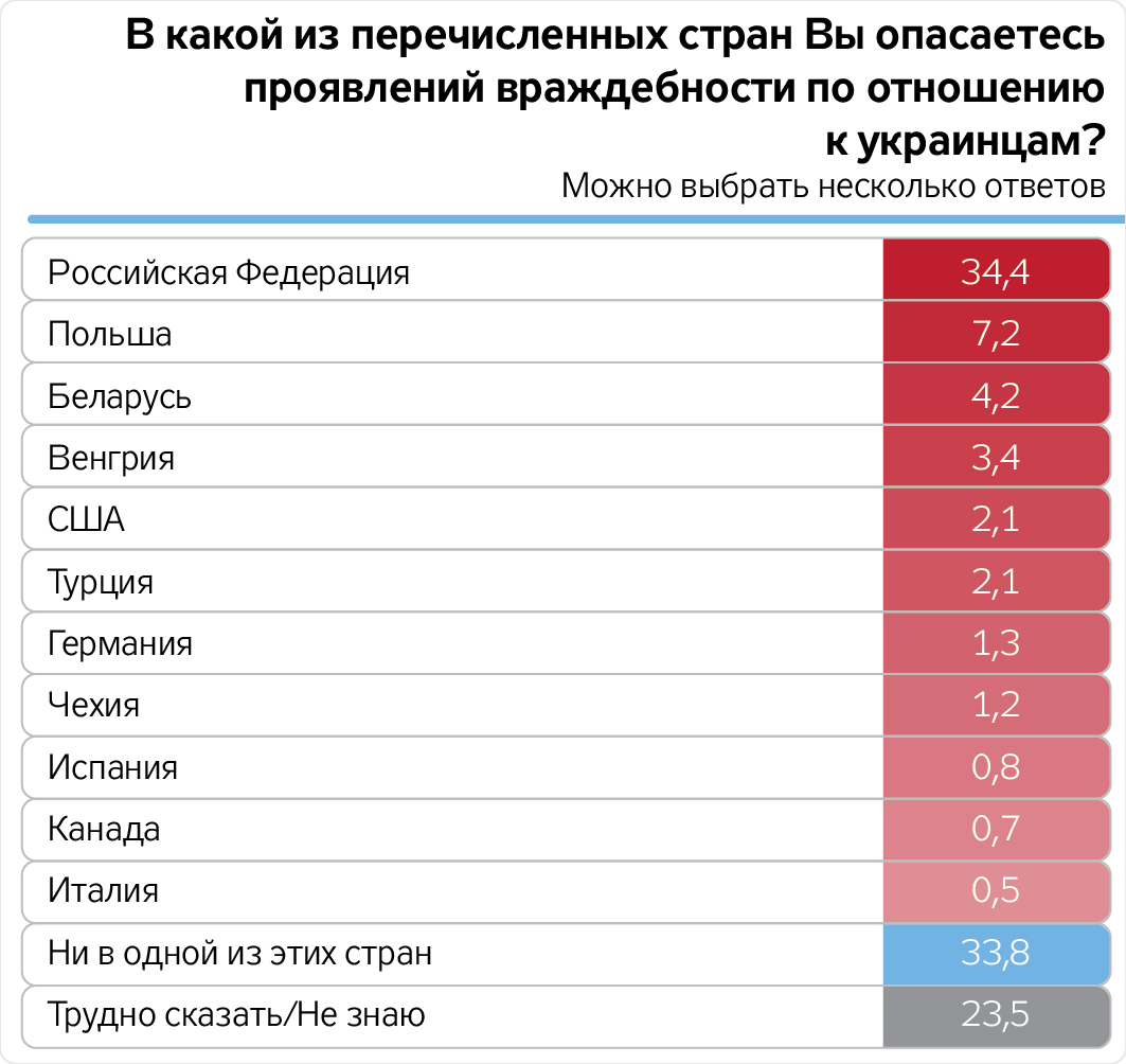 При этом только 4,9% опрошенных остановили свой выбор на России. В "шорт-листе" наиболее привлекательных государств-работодателей РФ уступает Чехии, Италии, США, Канаде и существенно проигрывает Польше и Германии. Более того, в табели стран, где гипотетические заробитчане опасаются проявлений враждебности в отношении украинцев, Россия уверенно лидирует (34,4%). Занимающая в данном рейтинге второе место Польша отстает по этому показателю от РФ на 27,2%.