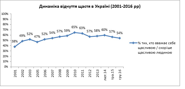 В декабре 2016 года счастливыми или скорее счастливыми себя чувствовали 54% жителей Украины, 25% чувствовали себя частично счастливыми, частично нет, и 19% - несчастливыми или скорее несчастливыми, свидетельствуют данные опроса КМИС.