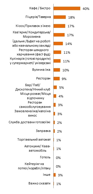 Жители Украины предпочитают "демократические" заведениям общественного питания. К лидерам можно отнести кафе или бистро, на которые приходится 40% всех последних посещений. Популярными также является питание в пиццериях (18%), кафе (17%) и покупка готовой еды в уличных киосках/прилавках с едой (17%).