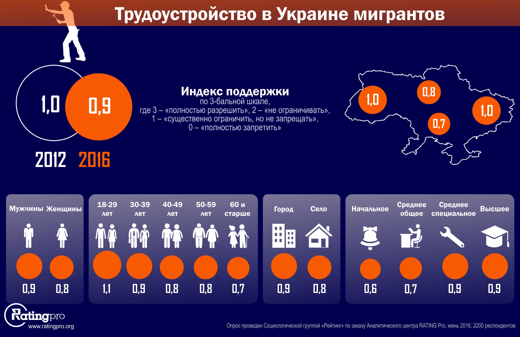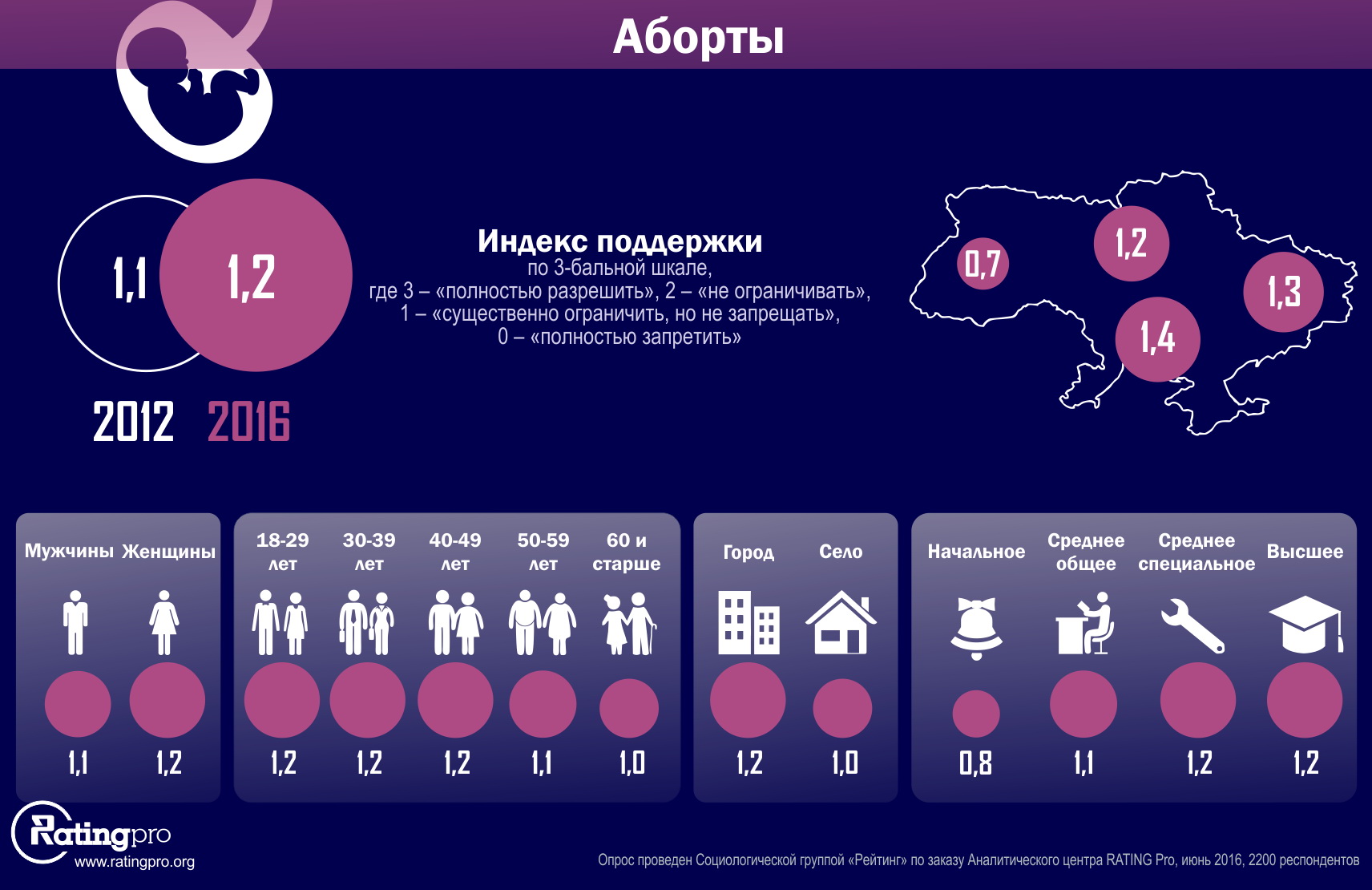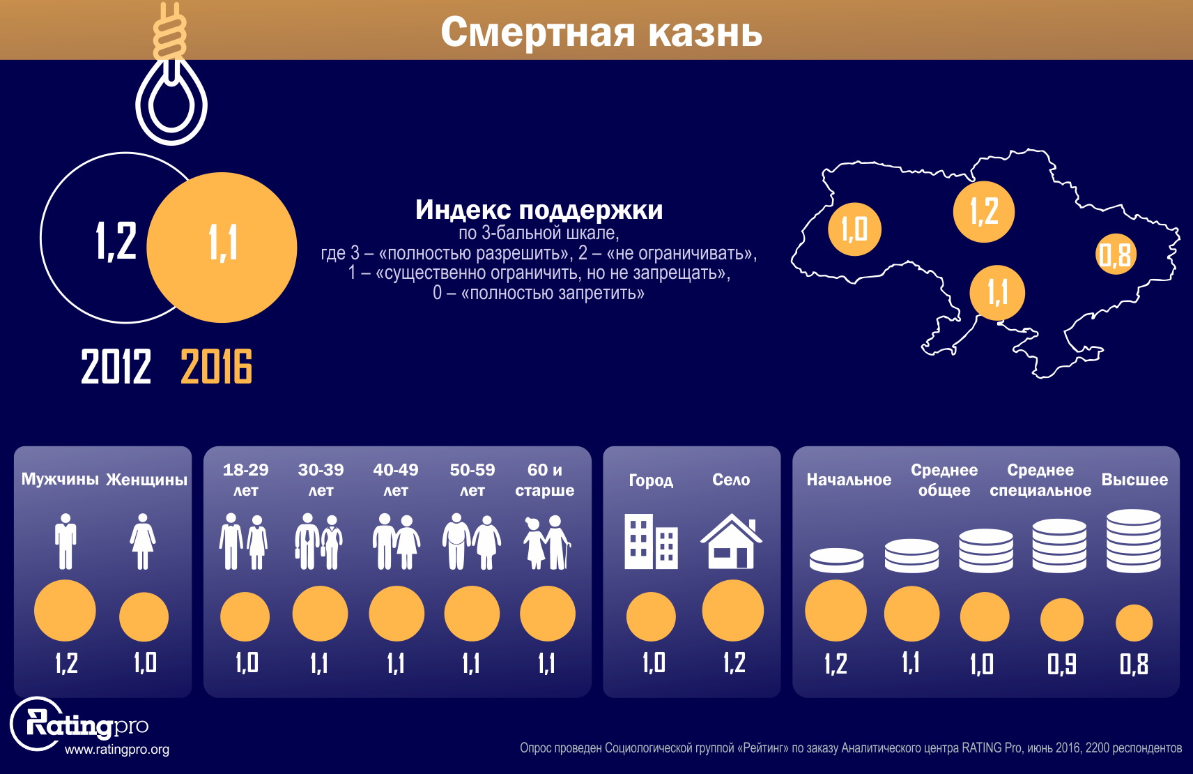 Опрос проведен Социологической группой "Рейтинг" по заказу Аналитического центра RATING Pro в течение 21-28 июня 2016 года среди 2200 респондентов во всех регионах Украины, кроме оккупированных территорий. Ошибка репрезентативности не более 2,1%.