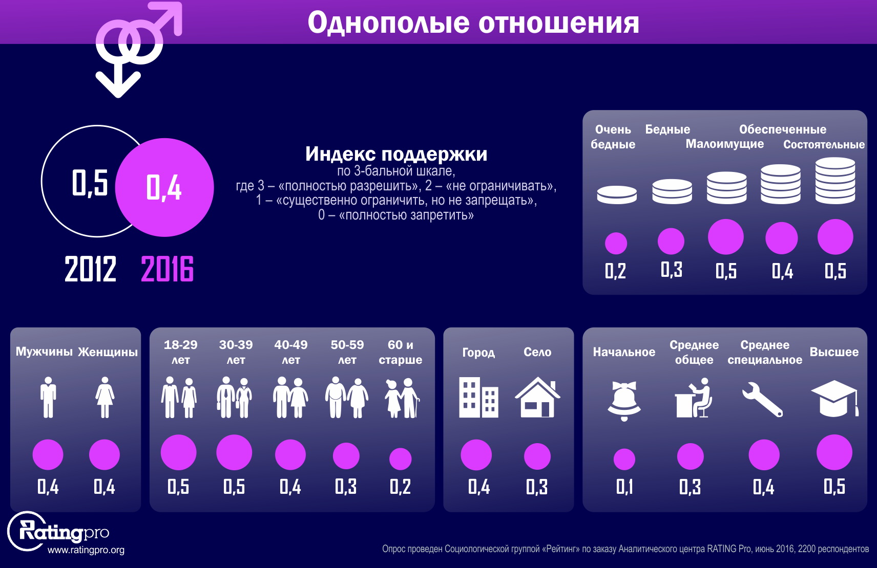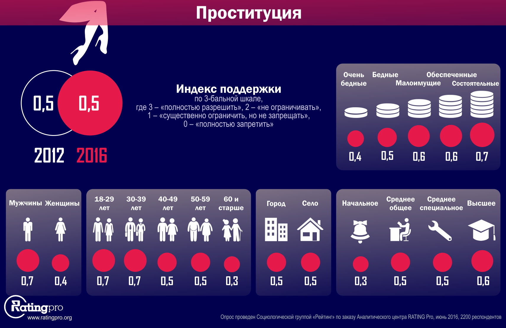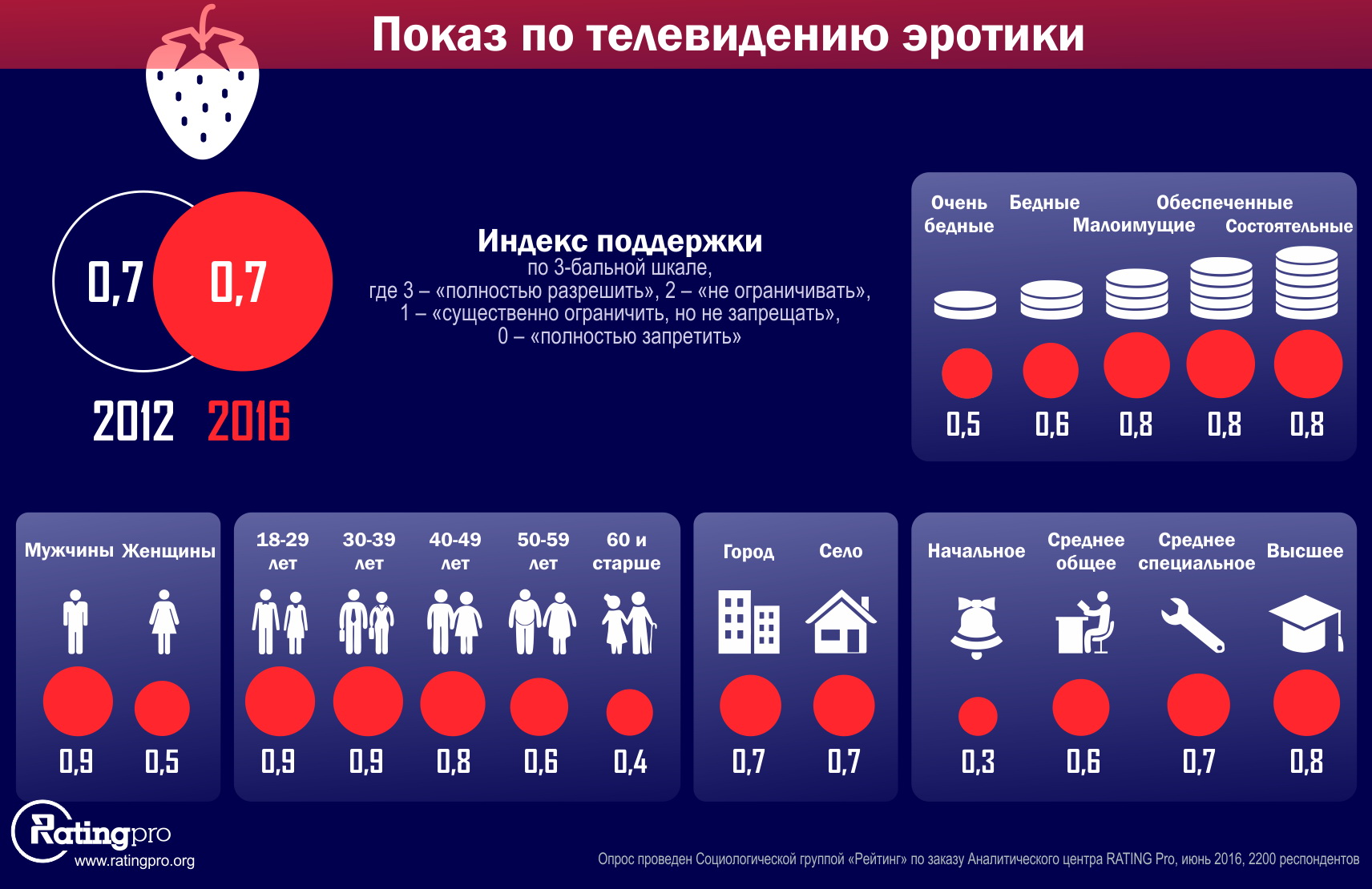 Опрос проведен Социологической группой "Рейтинг" по заказу Аналитического центра RATING Pro в течение 21-28 июня 2016 года среди 2200 респондентов во всех регионах Украины, кроме оккупированных территорий. Ошибка репрезентативности не более 2,1%.