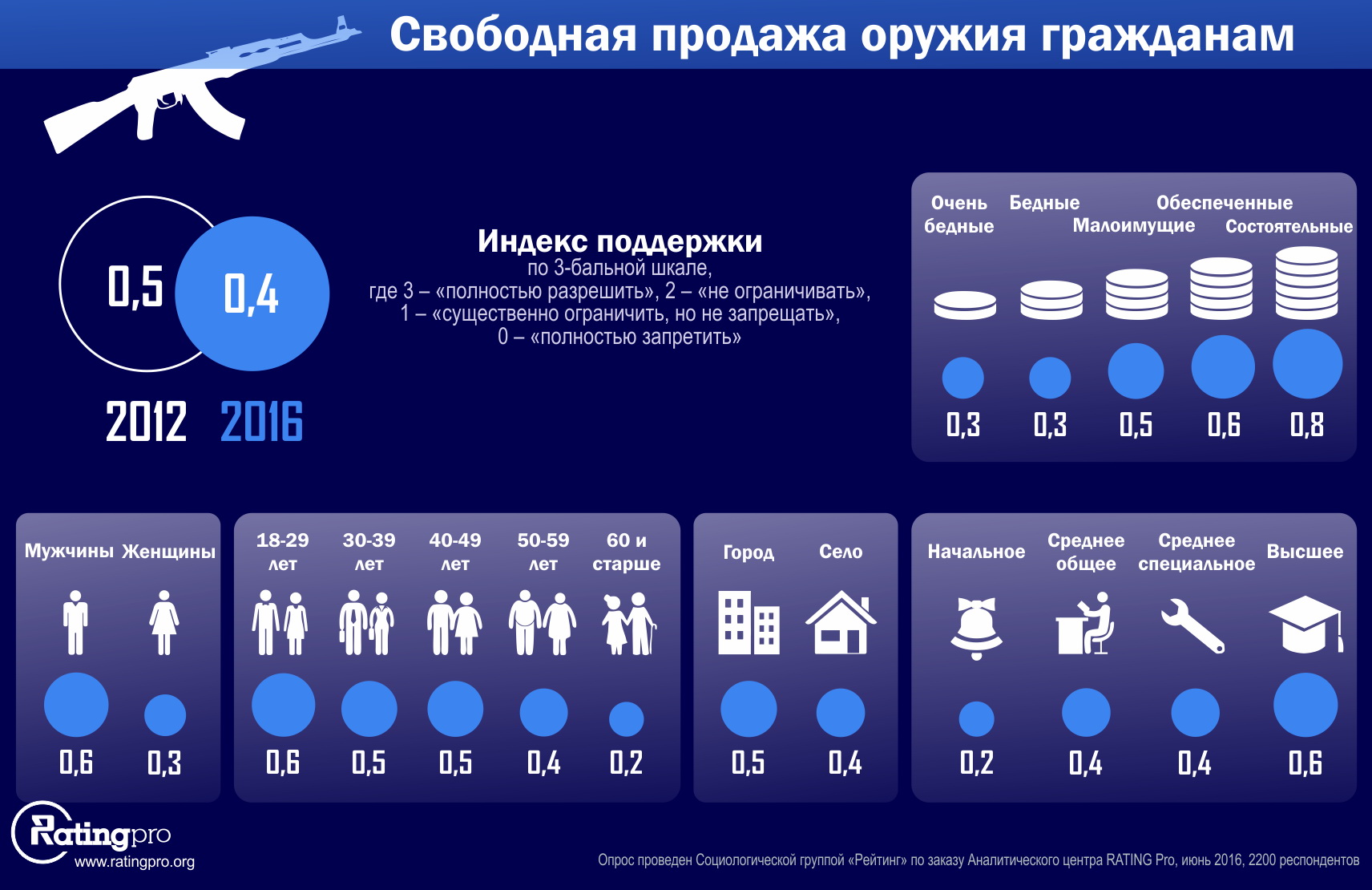 Так, за полный доступ или, по крайней мере, за ограничение свободной продажи оружия для граждан выступают 11% респондентов, 17% - считают, что следует существенно ограничить, но не запрещать, при этом большинство (69%) - за полный запрет.