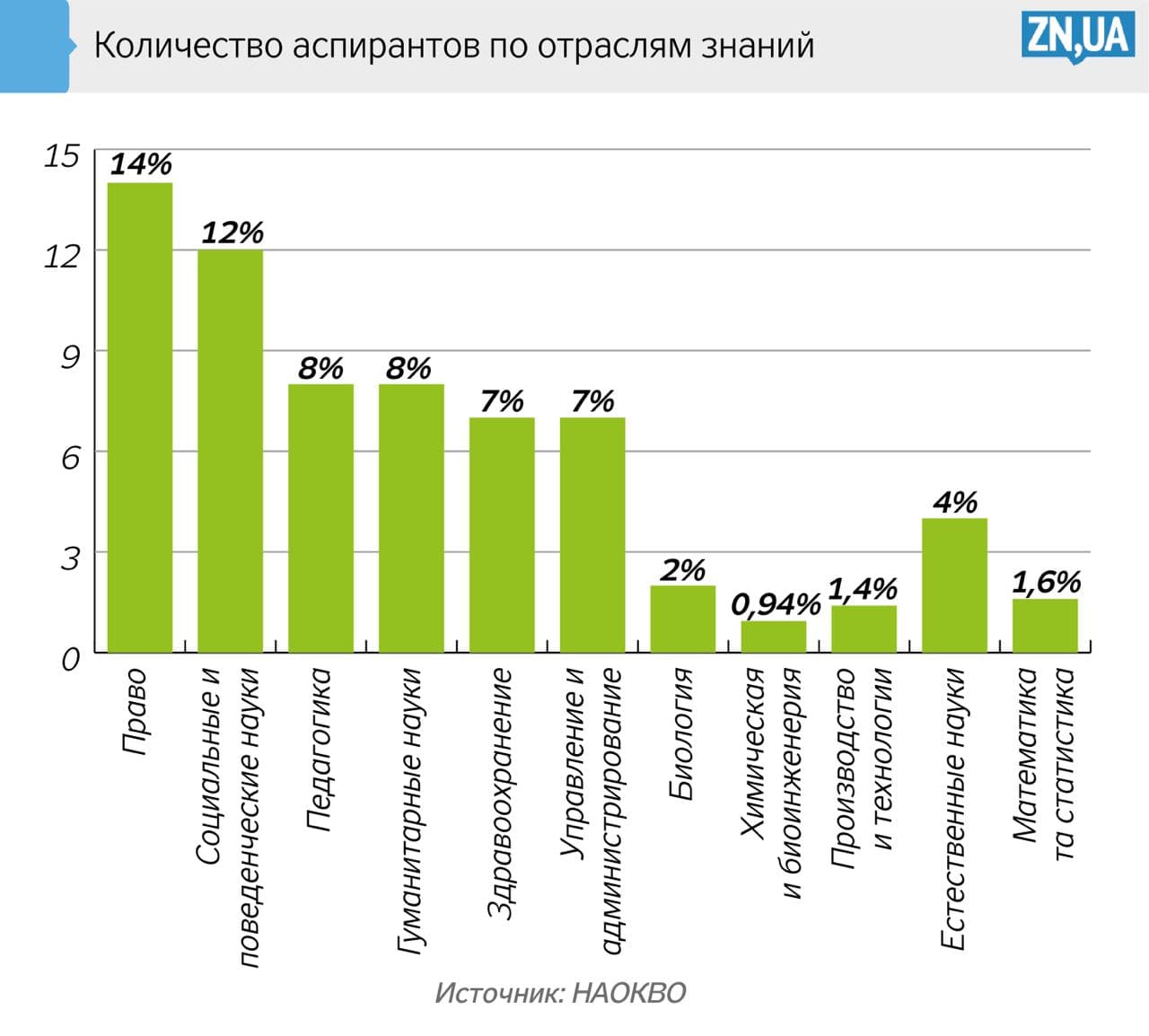 В Украине больше аспирантов обучается по специальностям право (14%), социальные и поведенческие науки (12%), педагогика (8%) и гуманитарные науки (8%). Соответствующие данные приводит Национальное агентство по обеспечению качества высшего образования в своем годовом отчете (НАОКВО).
