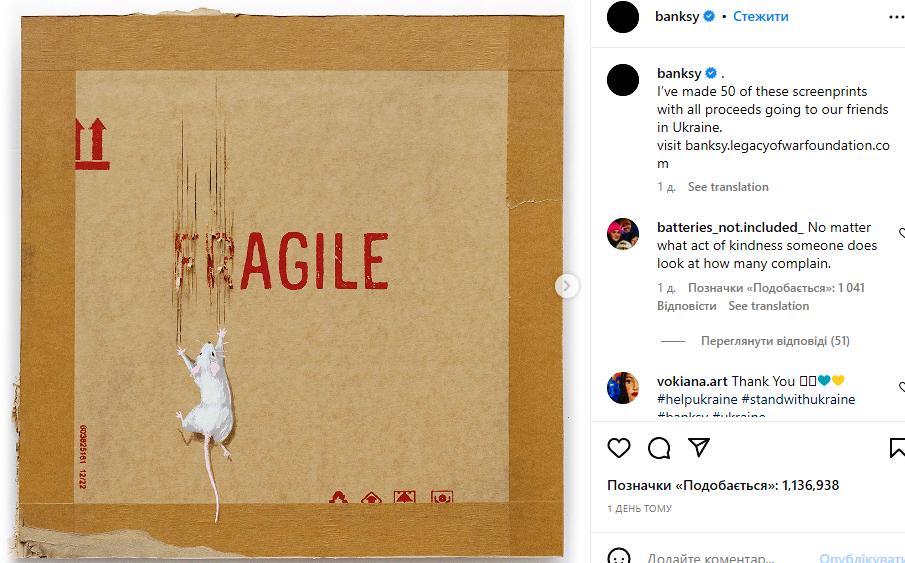 Британский уличный художник Бэнкси создал 50 работ-трафаретов, которые намерен продать, а вырученные средства — передать в помощь Украине. Об этом художник сообщил в своем Instagram, пишет Forbes.