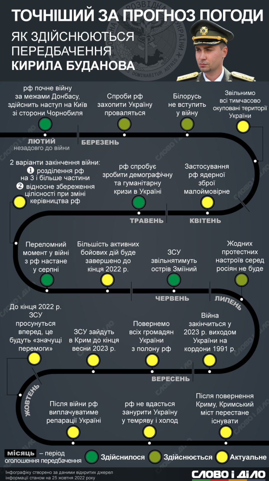 "В принципе двигается по графику. Если вы упомянули об этом графике, вы говорили что-то сбылось, что-то не сбылось. Там не так надо задавать вопросы. Там сбылось на самом деле все. Просто есть еще определенные моменты, которые по времени не прошли. Все будет так, как мы и говорили", - сказал Буданов.