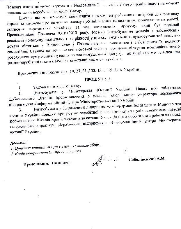 Бывший руководитель Госинформюста Виталий Добжанский обратился в Шевченковский районный суд Киева с иском о признании его увольнения незаконным, восстановлении на работе и взыскании зарплаты за время вынужденного прогула.
