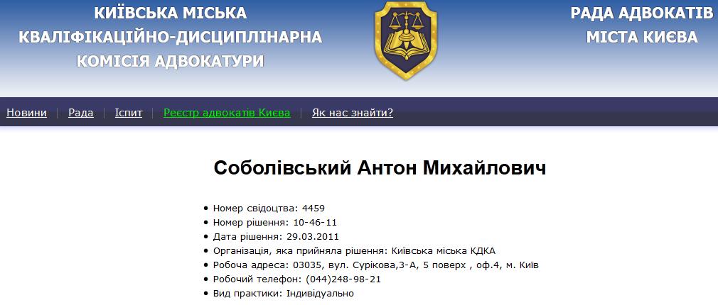 По данным Совета адвокатов Киева, Антон Соболевский в 2011 году получил свидетельство о праве на занятие адвокатской деятельностью и, по странному стечению обстоятельств, его место работы совпадает с адресом офиса ООО "Арт-мастер": ул. Сурикова 3-А.
