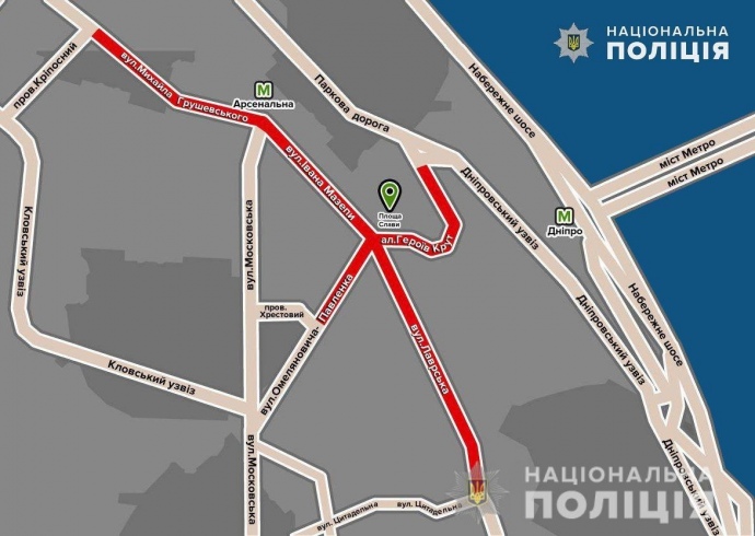 КГГА сообщало, что с 5 утра перекрыто движение на улицах Грушевского (от переулка Крепостного до улицы Арсенальной), Московской (от Кловского спуска до площади Арсенальной), Мазепы (от площади Арсенальной до улицы Лаврской), Н. Омеляновича-Павленко, Лаврской (от улицы Мазепы до улицы Цитадельной).