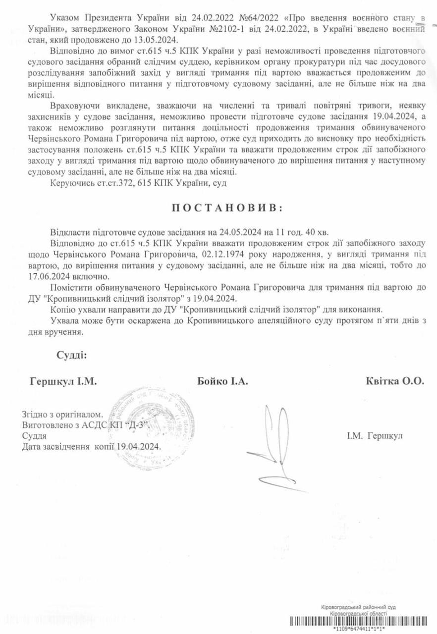 «Учитывая изложенное, учитывая многочисленные и длительные воздушные тревоги, неявку защитников на судебное заседание, невозможно провести подготовительное судебное заседание 19.04.2024, а также невозможность рассмотреть вопрос о целесообразности продолжения содержания обвиняемого Червинского Романа Григорьевича под стражей, суд пришел к выводу о необходимости ст.615 ч.5 УПК Украины и считать продленным срок действия меры пресечения в виде содержания под стражей в отношении обвиняемого к решению вопроса в следующем судебном заседании, но не более чем на два месяца», - говорится в постановлении суда.