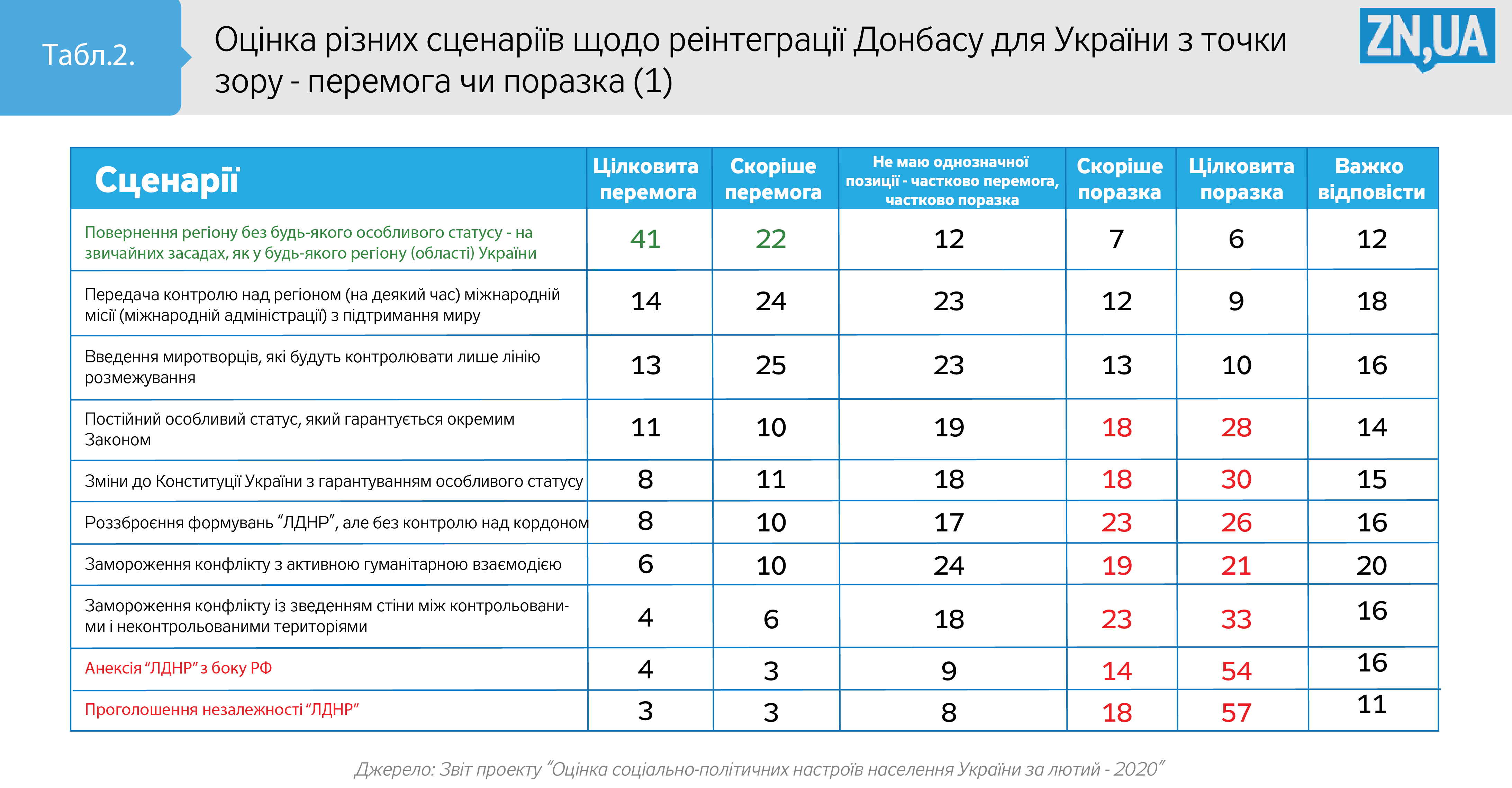 "Самым грандиозным из них, по результатам опроса, выглядит "провозглашение независимости "ЛНР/ДНР", - три четверти респондентов назвали его поражением (57% - полным, еще 18% - скорее). Даже "аннексия "ЛНР/ДНР" со стороны РФ" рассматривается как поражение меньшим числом украинцев (68%), чем "добровольный" уход неподконтрольной части Донбасса в свободное плавание", - говорится в материале (табл. 2).