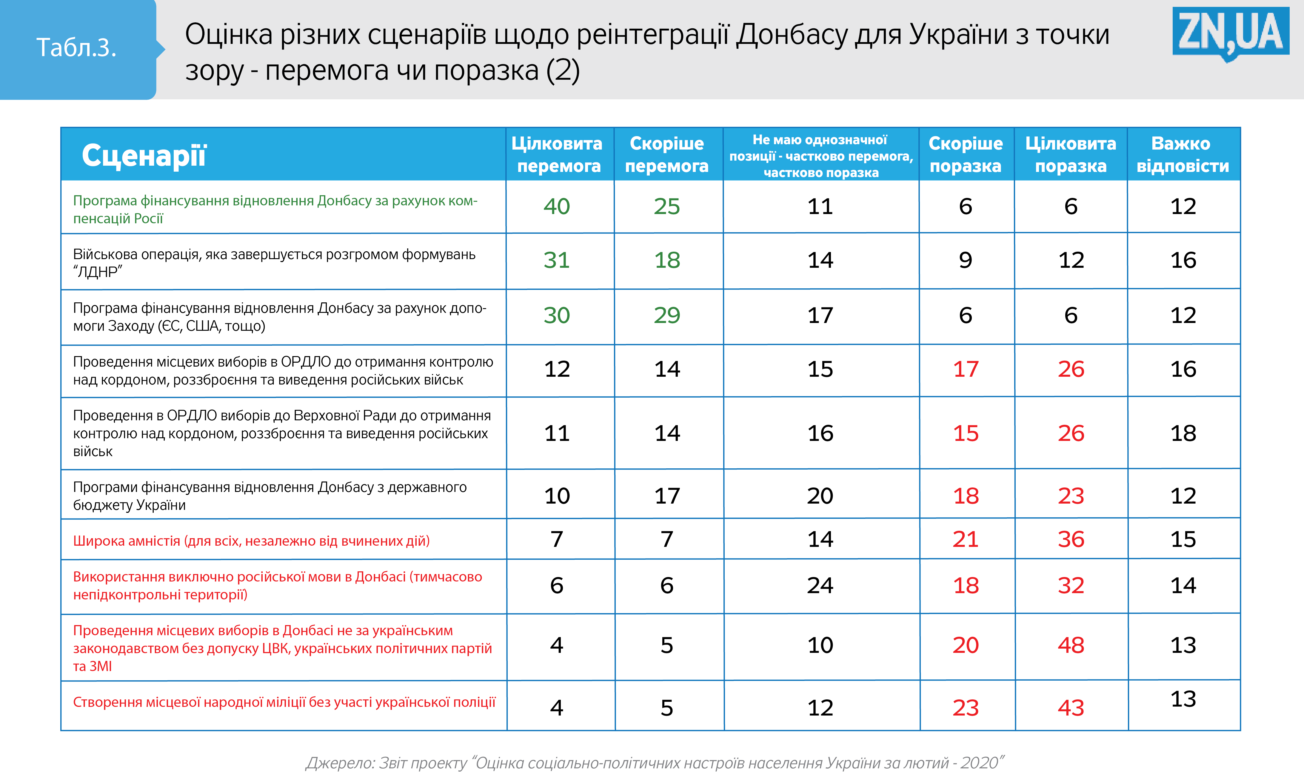 Максимальное число голосов - 65% - набрала программа финансирования восстановления Донбасса за счет компенсаций России: 40% наших соотечественников считают это полной победой, 25% - скорее победой (табл. 3).