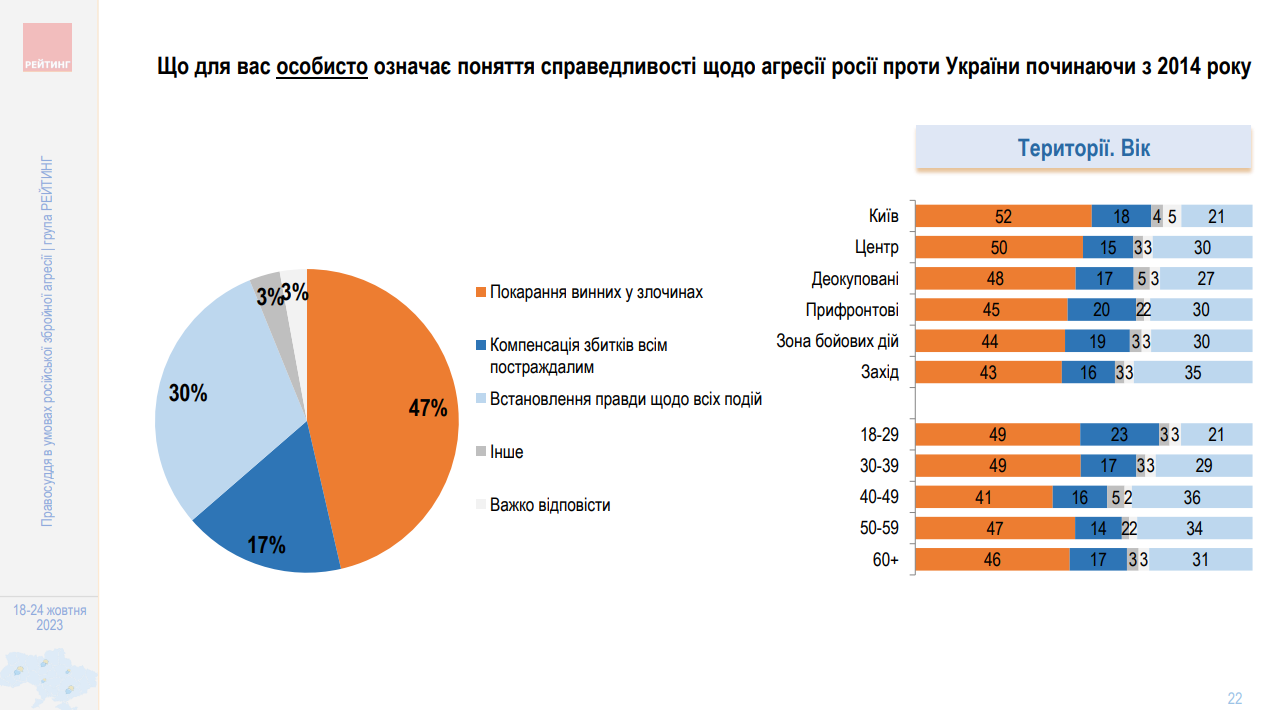 Почти половина украинцев, а точнее 47%, вкладывают в понятие справедливости в контексте военной агрессии России против Украины наказание виновных в военных преступлениях. Еще для 30% оно предусматривает установление правды по всем событиям, а для 17% — компенсация ущерба всем пострадавшим. Такие данные социологического исследования опубликовала социологическая группа "Рейтинг".