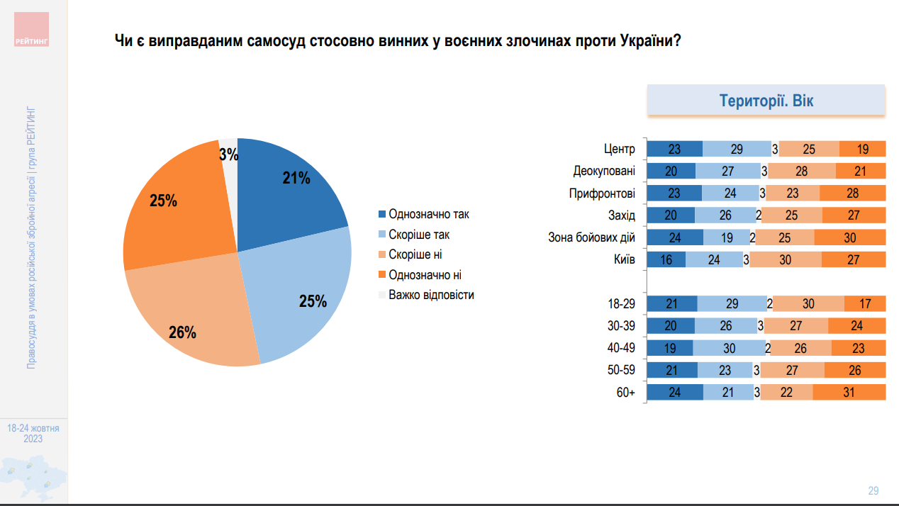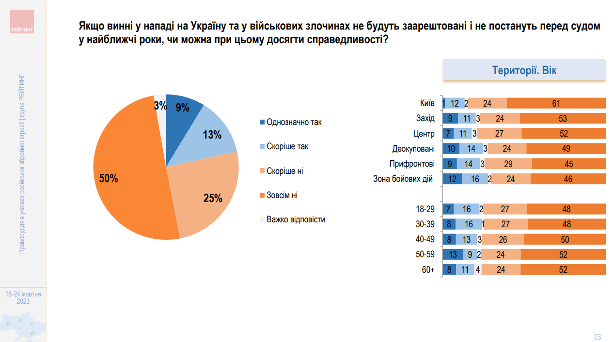 При этом 75% граждан считают, что справедливости можно будет достичь только благодаря суду над виновными в нападении на Украину и военных преступлениях. В возможность достижения справедливости без судебных дел верят 22%.