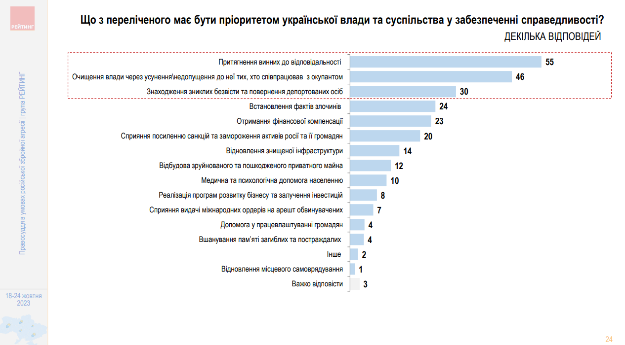 Чаще всего опрошенные граждане среди приоритетов в работе украинской власти и общества в обеспечении справедливости говорили о привлечении виновных к ответственности, очищении власти через устранение и недопущение к ней сотрудничавших с оккупантами, нахождение пропавших без вести и возвращение депортированных лиц. Около четверти опрошенных заявили о необходимости установления фактов преступлений и получении финансовой компенсации, каждое пятое - об усилении санкций и замораживании активов России и ее граждан.