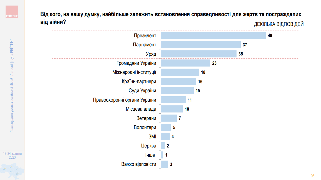 При этом установление справедливости, по мнению половины опрошенных, больше всего зависит от президента, еще 37% считают ответственным в этом парламент, а 35% — правительство. Четверть опрошенных считает, что ответственны граждане Украины. При этом наиболее последний тезис поддерживает молодежь.
