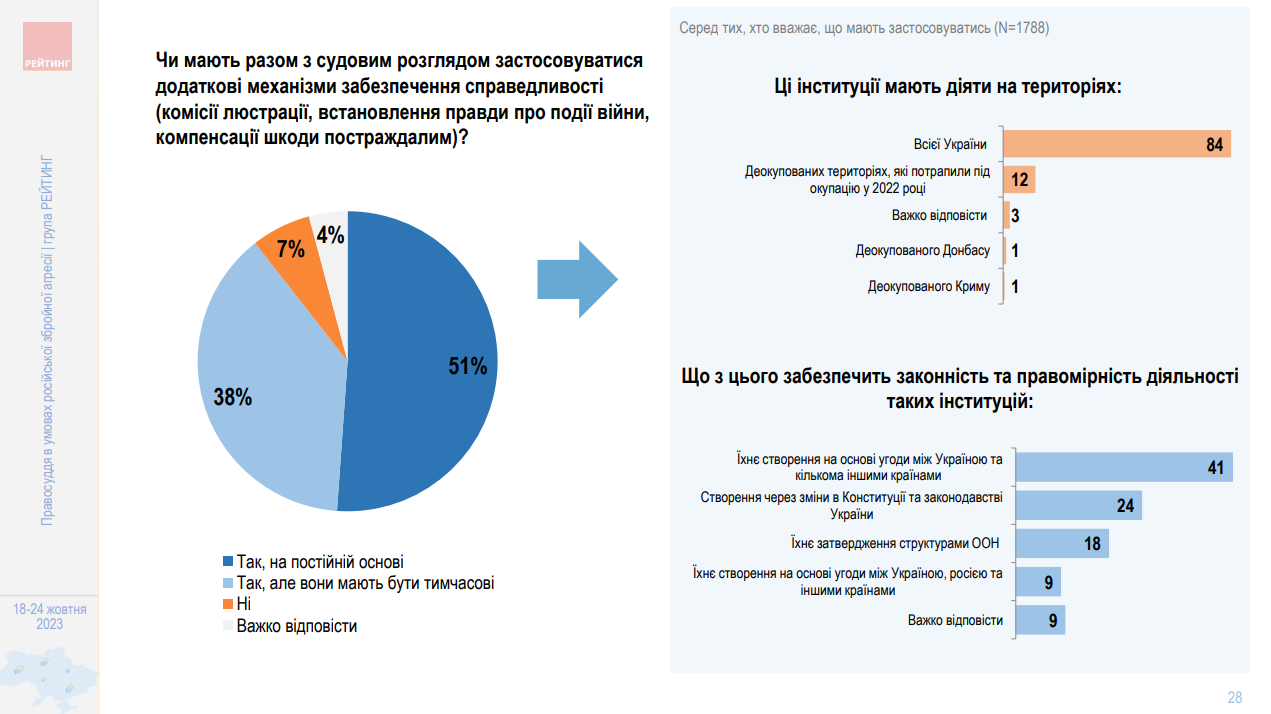 Почти 90 % опрошенных граждан заявили, что вместе с судебным разбирательством необходимо применять и дополнительные механизмы обеспечения справедливости, как люстрации, установление правды о событиях войны, компенсация ущерба пострадавшим. При этом 84% опрошенных считают, что такие механизмы должны действовать по всей Украине.