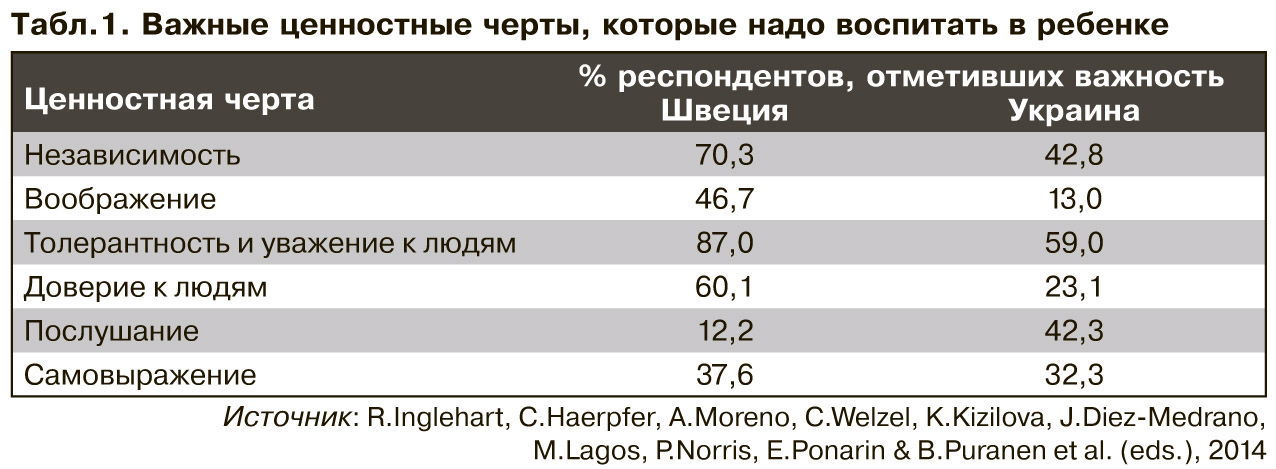 "Шведское общество в значительно большей степени, чем украинское, хочет развить у детей независимость, воображение, толерантность и доверие к людям, тогда как украинское делает ударение на послушании. Вряд ли сосредоточение воспитания на послушании, вместе со слабым воображением и недоверием, будет способствовать превращению Украины в политически независимое, демократическое и свободное государство с инновационной экономикой и собственным голосом в мире", - подчеркивает эксперт.