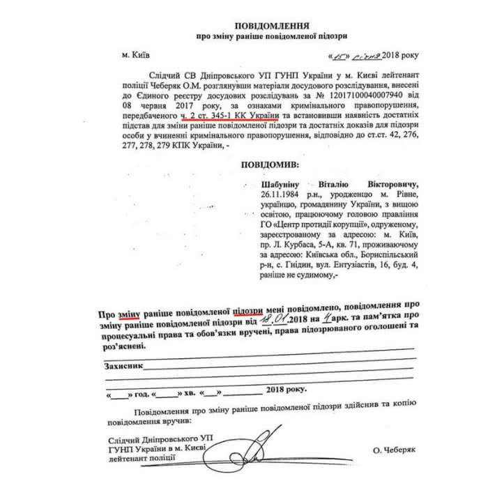 Как сообщили в ЦПК, подозрение было изменено 15 января и вручено сегодня, 18 января, следователем Чеберяком А.М Днепровского управления полиции. Он также сообщил, что досудебное следствие завершено и избирать меру пресечения подозреваемому не будут, а дело в ближайшее время будет направлено в суд.