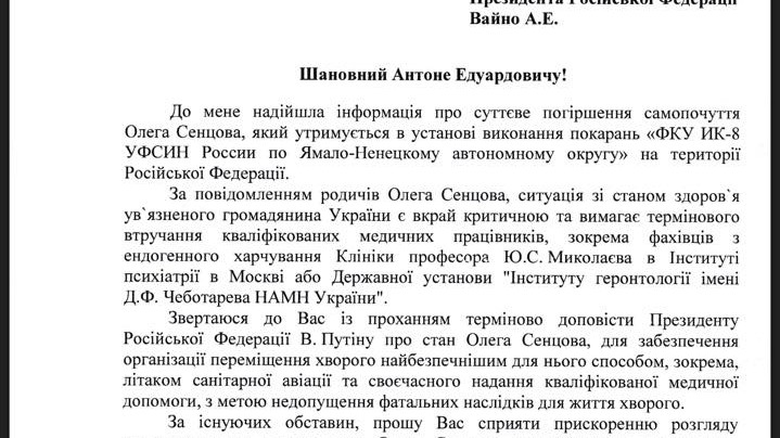 "Обратилась также к руководителю Администрации президента РФ Антона Вайна с просьбой срочно доложить президенту Российской Федерации о состоянии Олега Сенцова для организации перемещения больного безопасным для него способом, в частности самолетом санавиации и своевременного оказания квалифицированной медицинской помощи. Также при существующих обстоятельствах попросила способствовать ускорению рассмотрения ходатайства о помиловании Олега Сенцова компетентными государственными органами РФ", - написала Денисова.