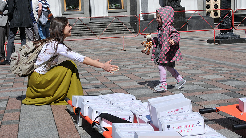 Президенту Украины активисты передали специальную "упаковку жизни" с детской шапочкой и пинетками. Ее принесла к Администрации президента беременная женщина, чтобы напомнить главе государства о его обещании провести медицинскую реформу.
