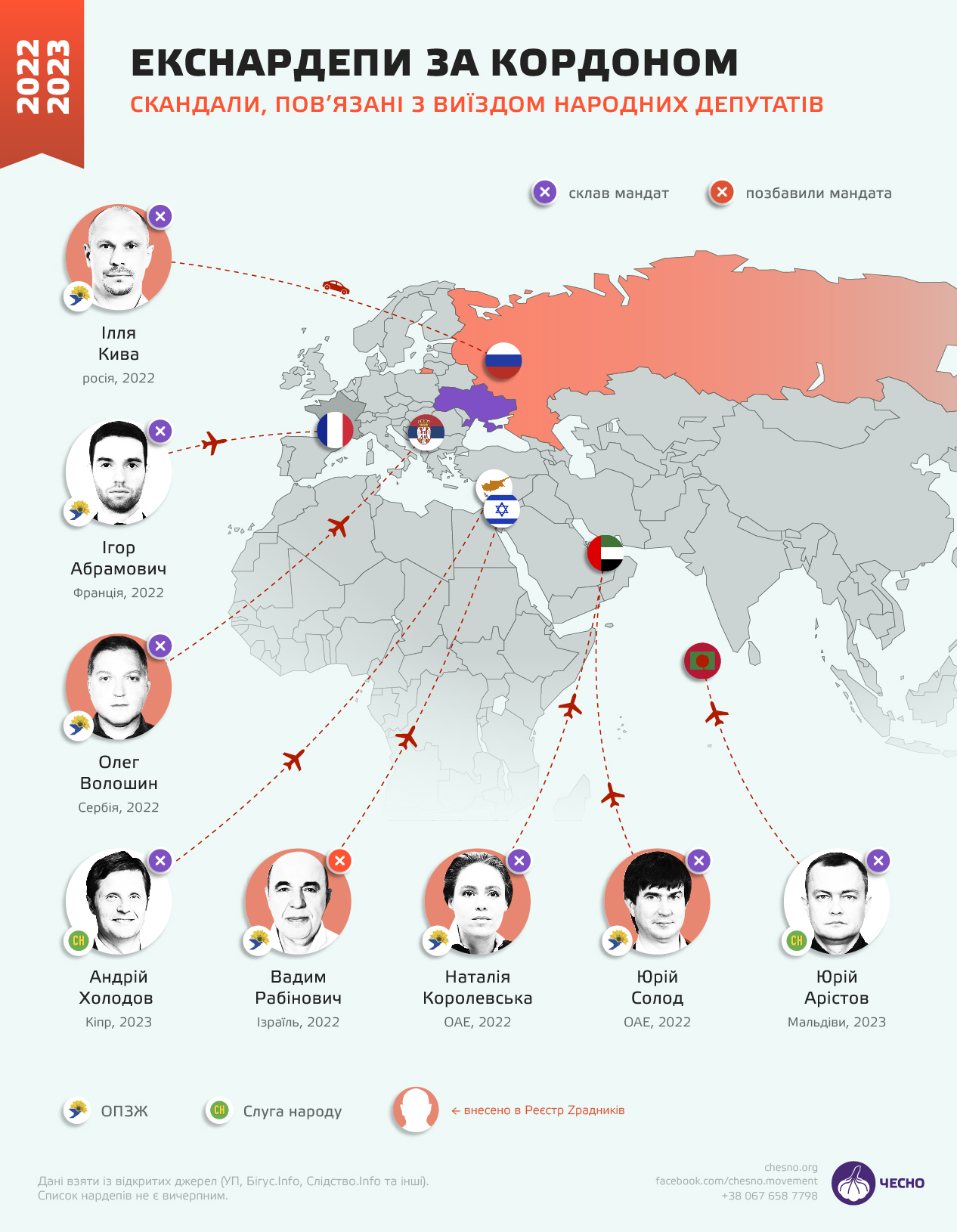 Кроме Тищенко, в начале года из Украины уехал другой «слуга народа» – Андрей Холодов. Когда бегство депутата на Кипр разоблачили журналисты, он написал заявление о сложении мандата. Холодов был лишен полномочий только летом 2023 года.
