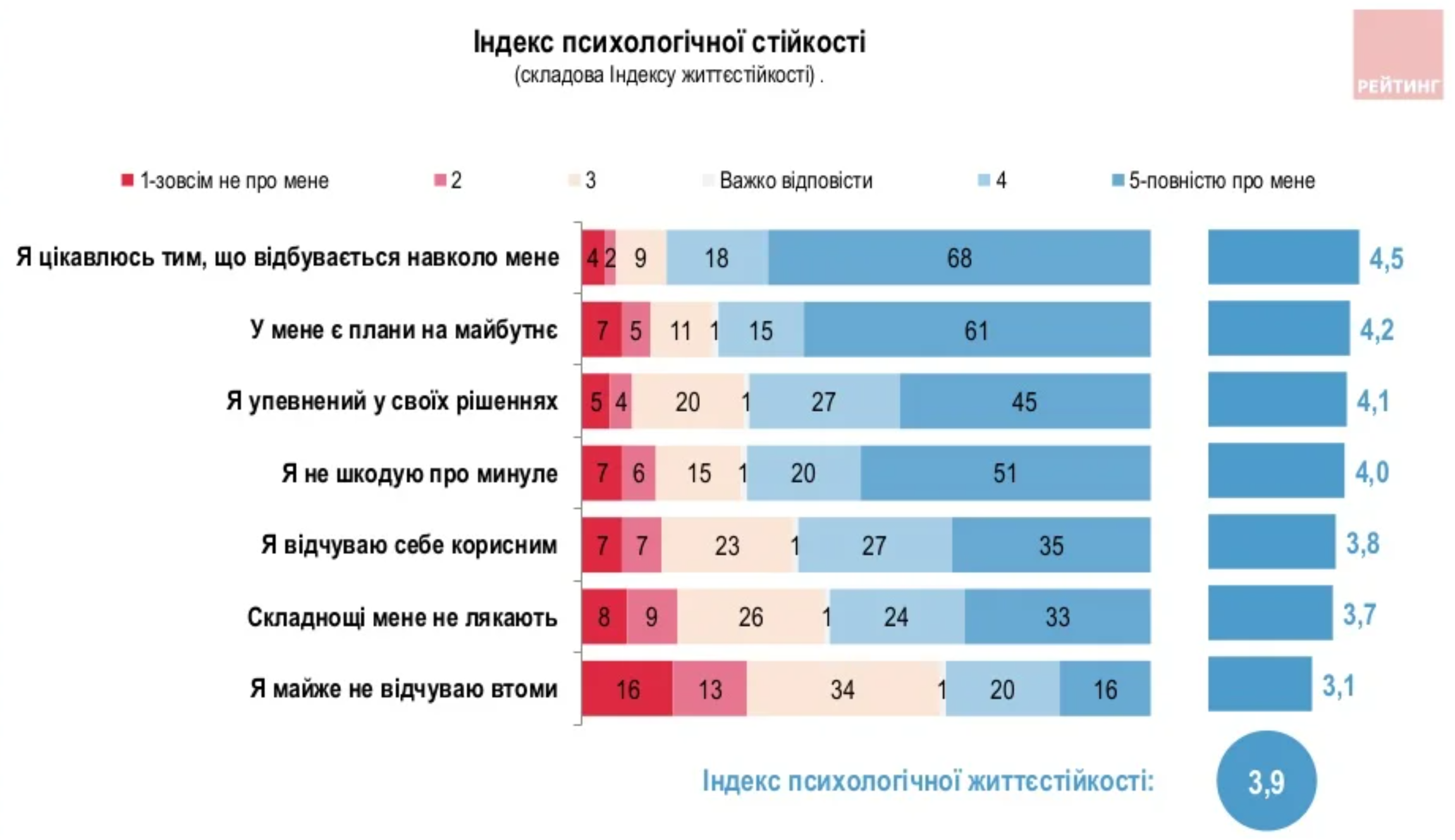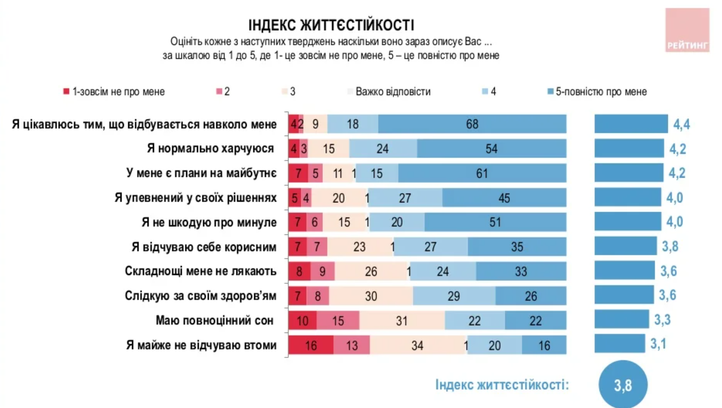 Относительно высокий показатель психологической устойчивости обеспечивается в первую очередь интересом к происходящему вокруг (4.4), нормальным питанием (4.2), планами на будущее (4.2), уверенностью в своих решениях (4.0) и отсутствием сожаления о прошлом (4.0).