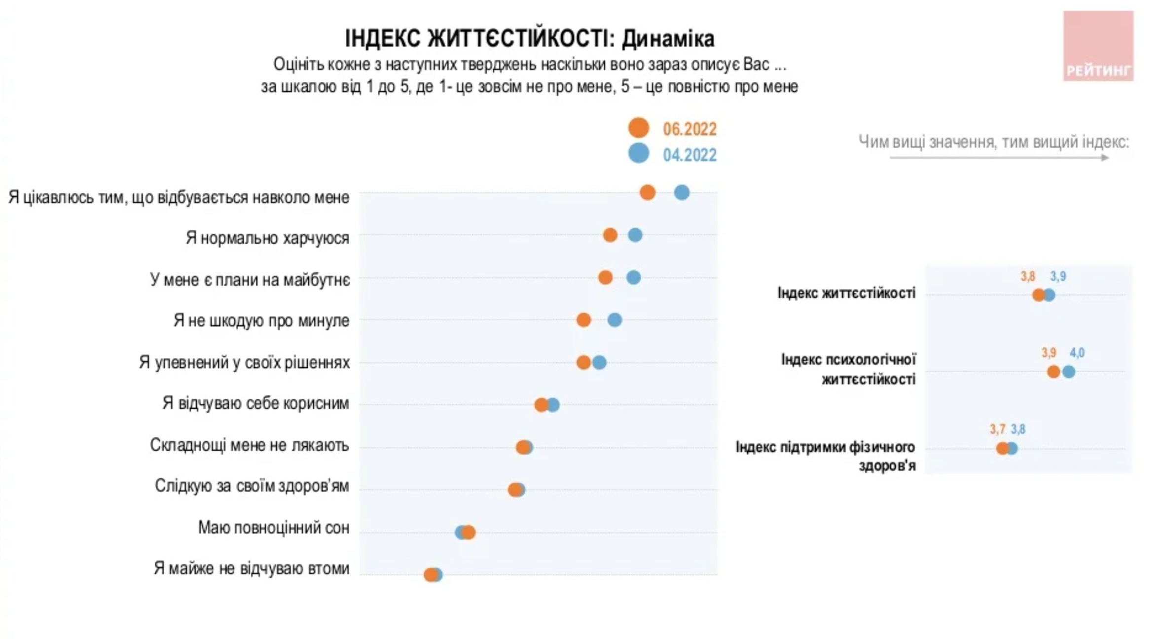 На четвертом месяце войны украинцы и дальше демонстрируют хороший уровень жизнестойкости — 3.8 из 5. Такие составляющие этого показателя: психологическая устойчивость (3.9) и поддержка физического здоровья (3.7) – не претерпели существенных изменений, хотя и несколько снизились по сравнению с апрелем, говорится в исследовании социологической группы «Рейтинг».