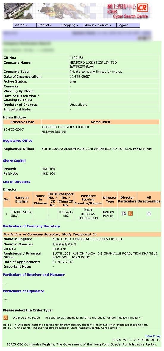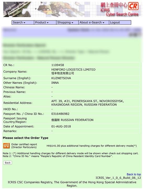 В свою очередь, по данным Центра кибер-поиска Информационной системы Интегрированного реестра компаний (ICRIS), позволяющего получить информацию о зарегистрированных и хранящихся в Реестре компаниях Китая - директором Henford Logistics Ltd является гражданка России из Новороссийска Инна Кузнецова.