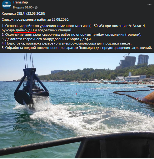 Сегодня проходит очередная операция по подъему танкера Delfi, который затонул на одном из центральных пляжей Одессы в ноябре прошлого года. Одной из компаний, занимающаяся подъемом, является скандально известная «Трансшип», которая привлекла к этому процессу российские буксиры DIAMOND N и TOPAZ N, сообщает УНИАН.