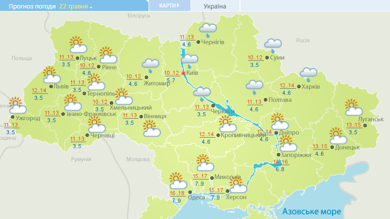 Так, по данным Укргидрометцентра, 22 мая в Украине облачно с прояснениями. Ночью в Черниговской, Сумской, утром и днем в северных, Черкасской, Полтавской и Харьковской областях небольшой дождь, на остальной территории без существенных осадков.