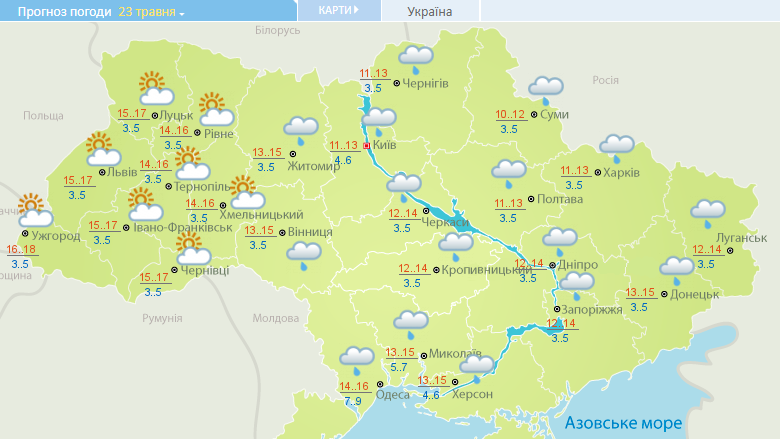 Температура ночью +1 +6, на Левобережье на поверхности почвы (в Карпатах и в воздухе) местами заморозки 0 +3; днем +10 +15, на Одесчине и в западных областях, 24 мая в Украине +13 +18.