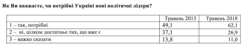 В мае 2018 года 62% граждан считали, что Украине нужны новые политические лидеры (в 2013 году такого мнения придерживались 49% респондентов), свидетельствуют данные опроса фонда "Демократические инициативы" и Центра Разумкова.