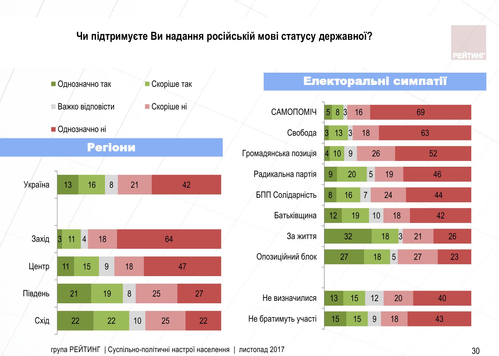 В ноябре 2017 года против предоставления русскому языку статуса государственного выступают 63% украинцев, поддерживают идею 29% респондентов, 8% - не определились, свидетельствуют данные опроса Социологической группы "Рейтинг".